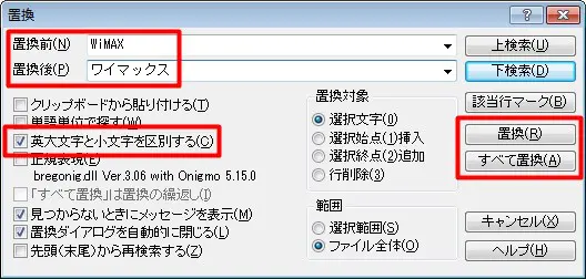 今回は「WiMAX」という文字列を「ワイマックス」という文字列に変更する例を示します。
