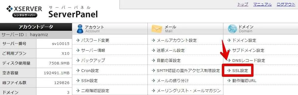 エックスサーバーのサーバーパネルの「ドメイン」の項目で「SSL設定」をクリック