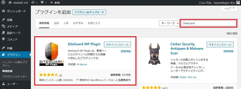 「プラグイン」「新規追加」をクリックし、右側にあるキーワードに「SiteGuard」と入力します。