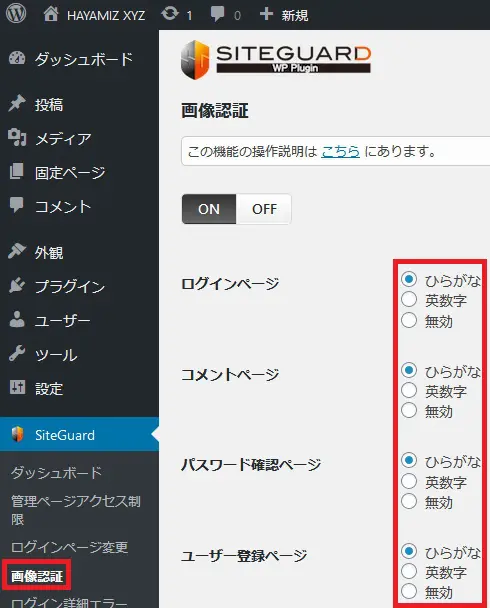 管理画面左画のメニュー一覧から「SiteGuard」「画像認証」をクリックします。