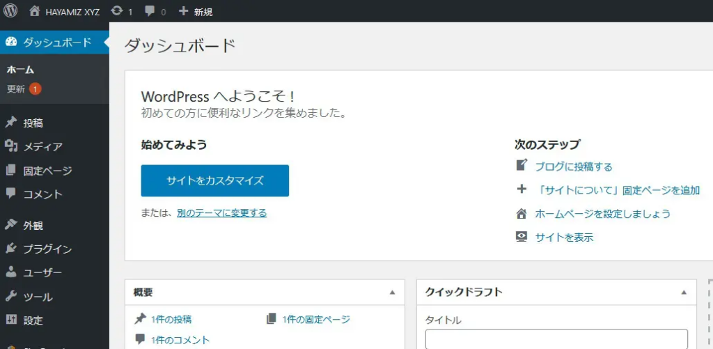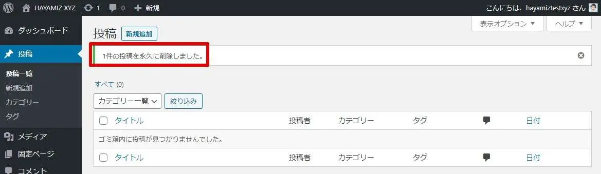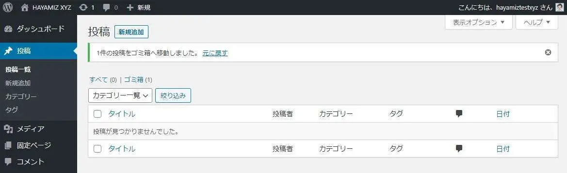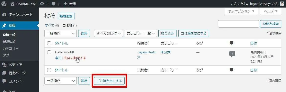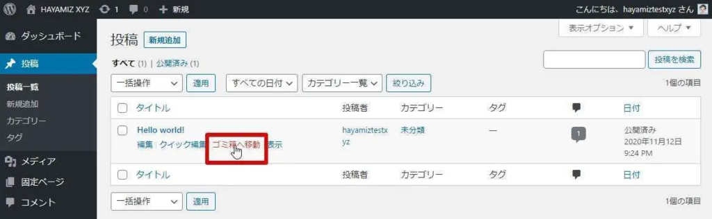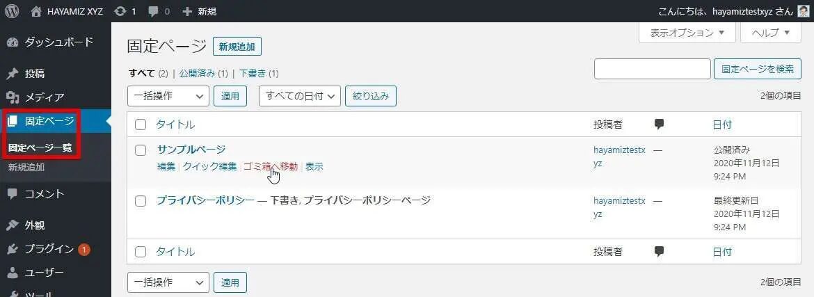 投稿一覧と固定ページにあるサンプルページはブログ運営をしていく際には不要ですので、削除します。