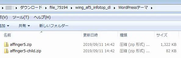 するとファイルがいくつかあると思いますので、affinger5.zipとaffinger5-child.zipという2つのファイルがあることを確認してください。