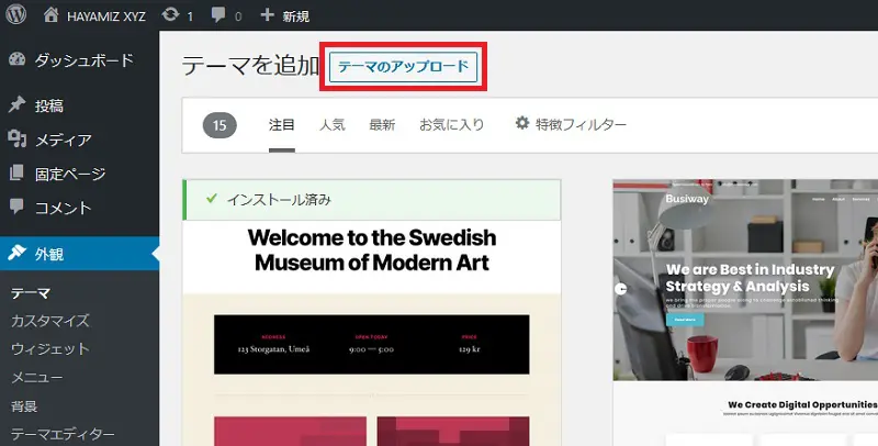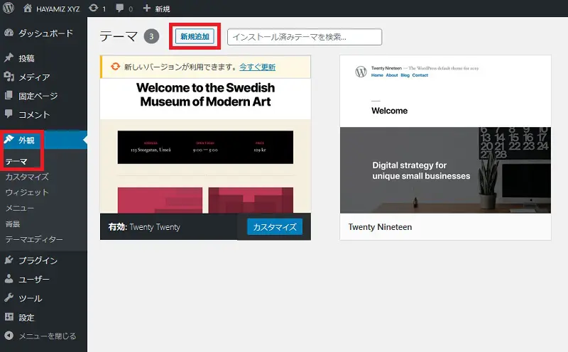 左側の列にメニューが並んでいますので、「外観」「テーマ」をクリックし、「新規追加」をクリックします。