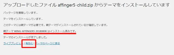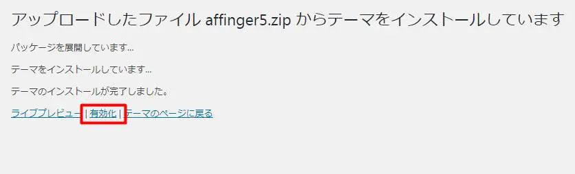 なお、アップロードをするとテーマを有効にするか聞かれますが、affinger5.zipをインストールした場合、赤枠が示している有効にはチェックを入れません!