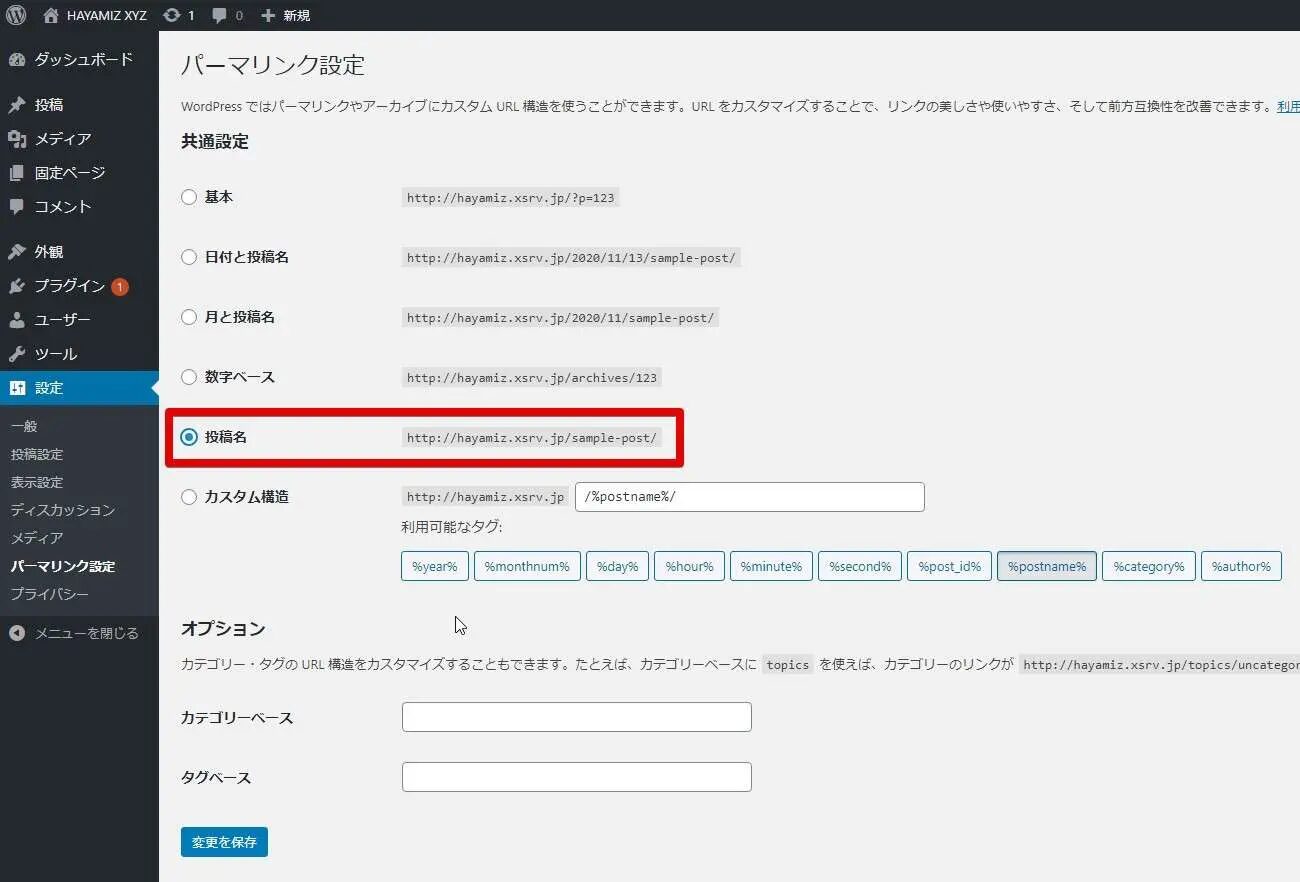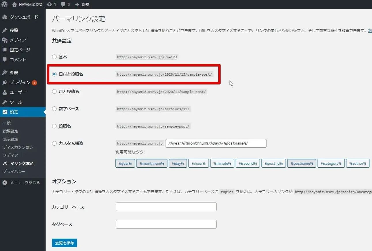 パーマリンクはいくつか形式を選べますが、初期設定は「日付と投稿名」となっています。