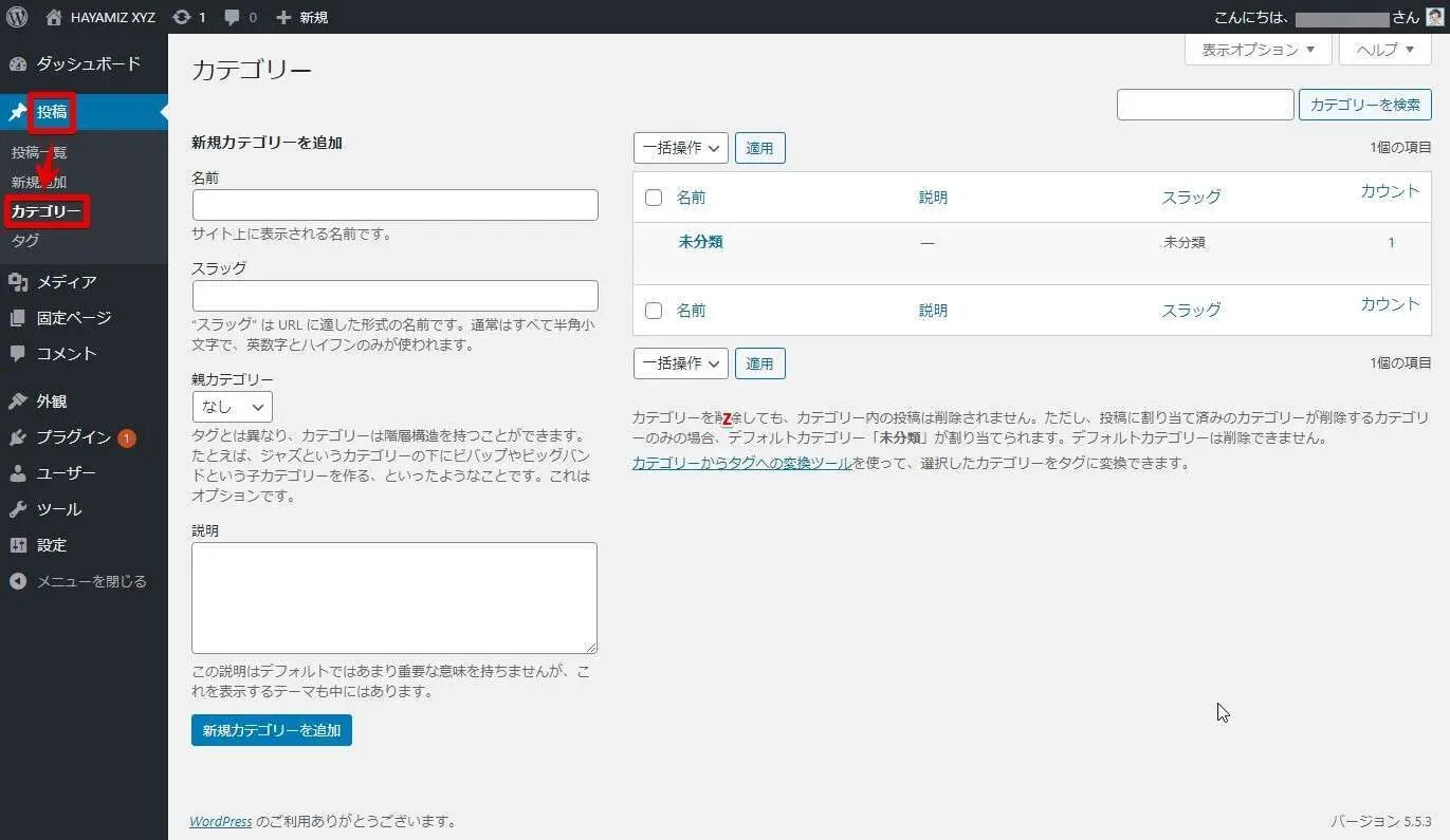 WordPress管理画面で「投稿」「カテゴリー」と進む