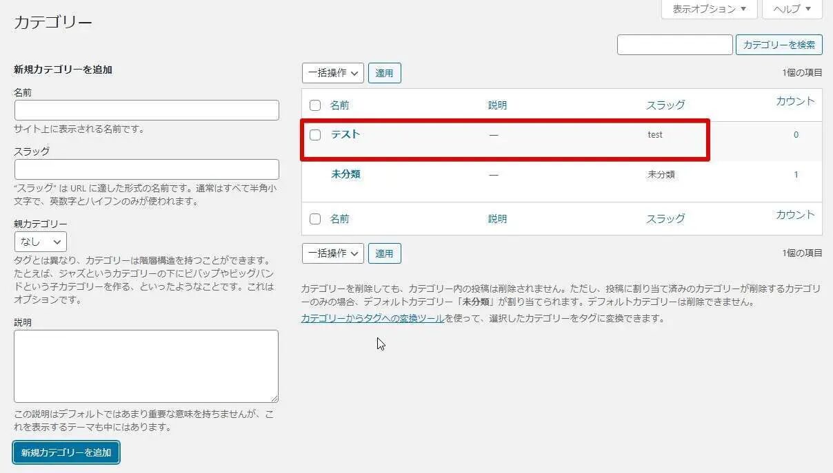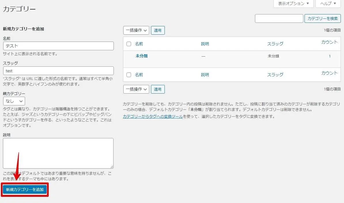 名前にカテゴリー名を入力し、スラッグには「名前を英語表記で表したものを入力」