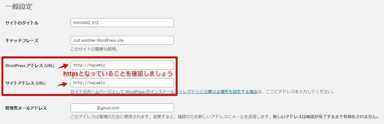 WordPressアドレスとサイトアドレスは「独自ドメイン」になっていることと、「https」となっているかの2点を確認します。