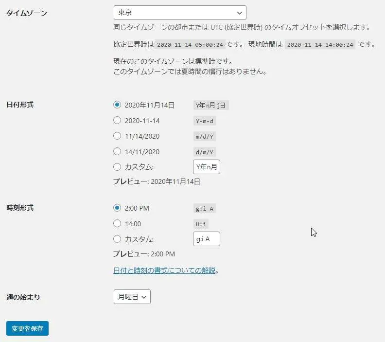 タイムゾーン・日付形式。時刻形式・週の始まりは初期設定のままでOK