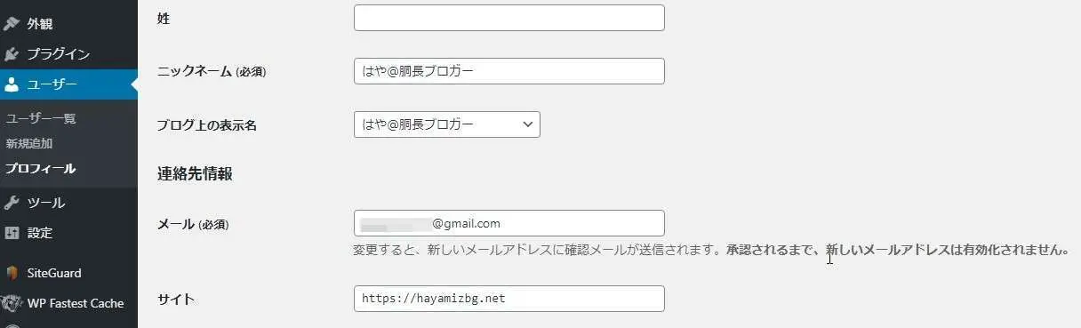 WordPress管理画面から「ユーザー」「プロフィール」とたどる