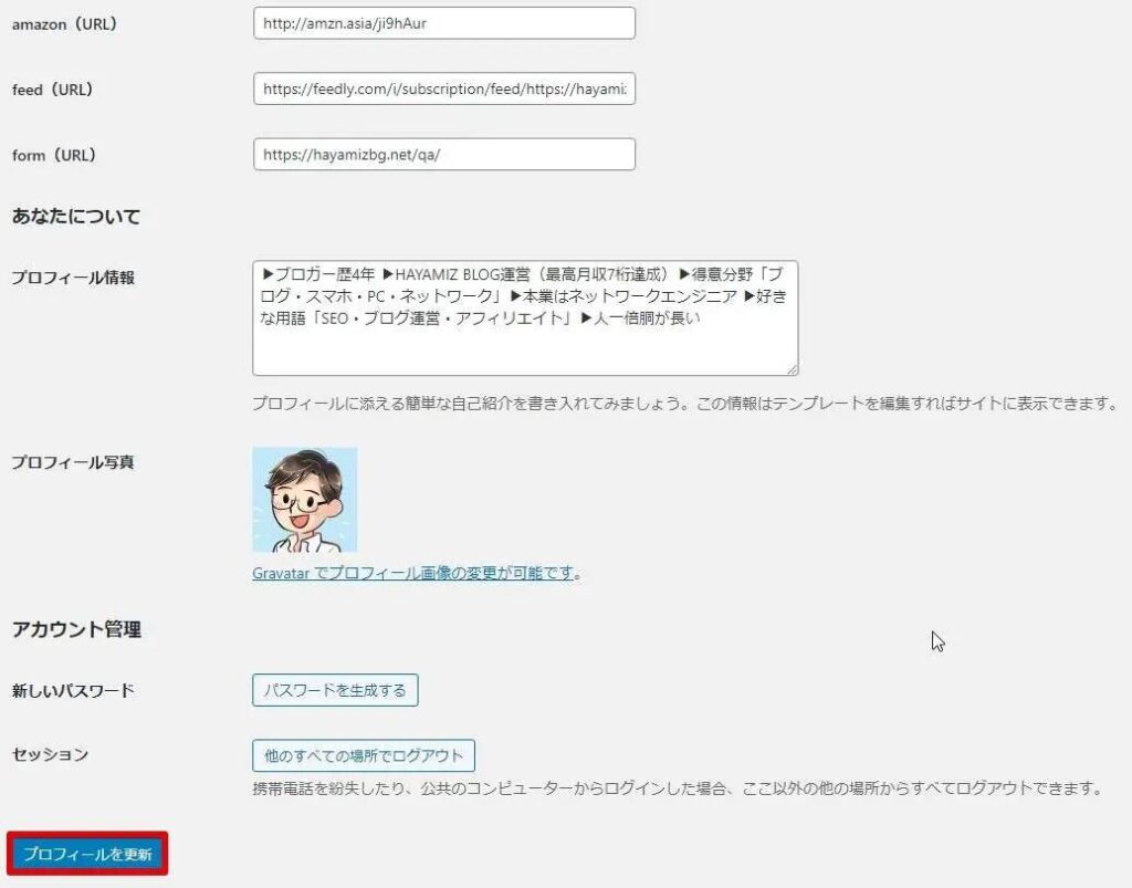 プロフィールが書けましたら「プロフィールの更新」をクリックして完了です。