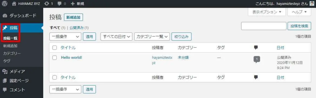 WordPress管理画面から「投稿」「投稿一覧」とたどる