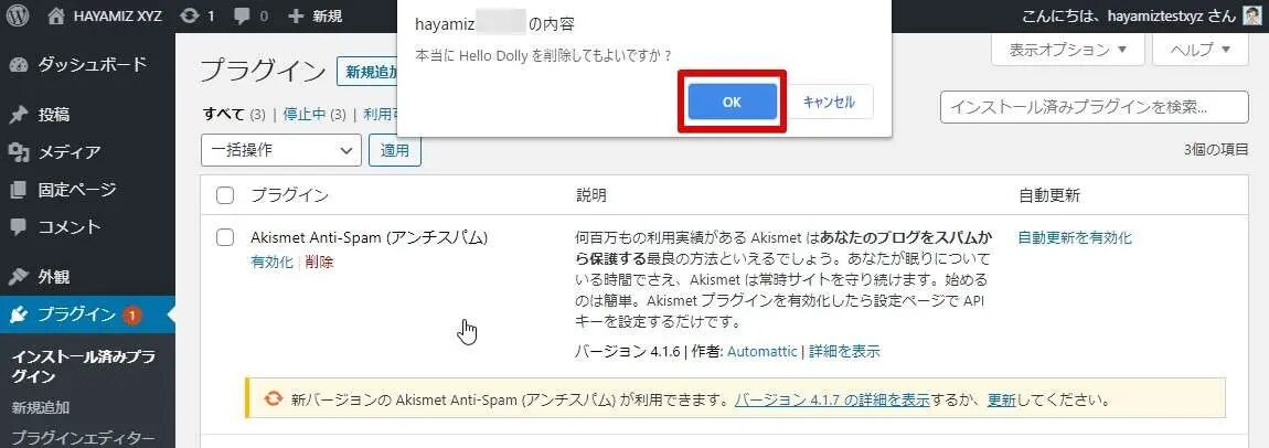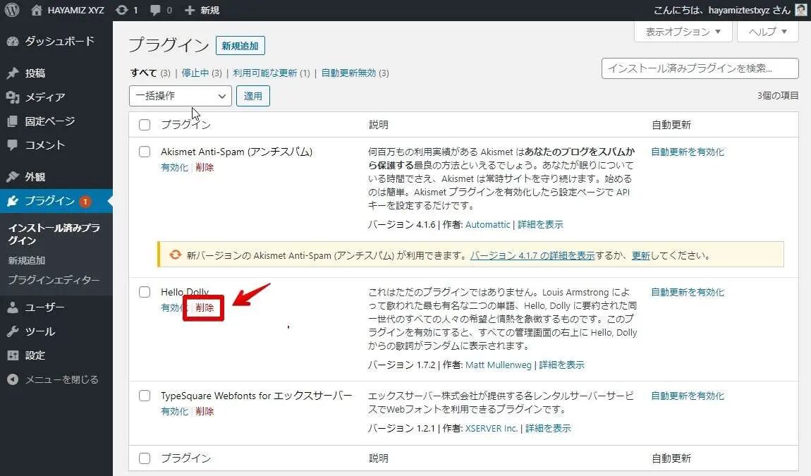 今回は「Hello Dolly」というプラグインを例に削除します。