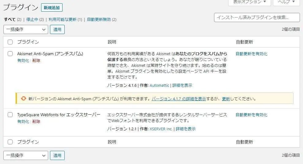 WordPressブログ完成後にインストールされているプラグインは2つです。
