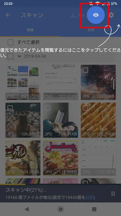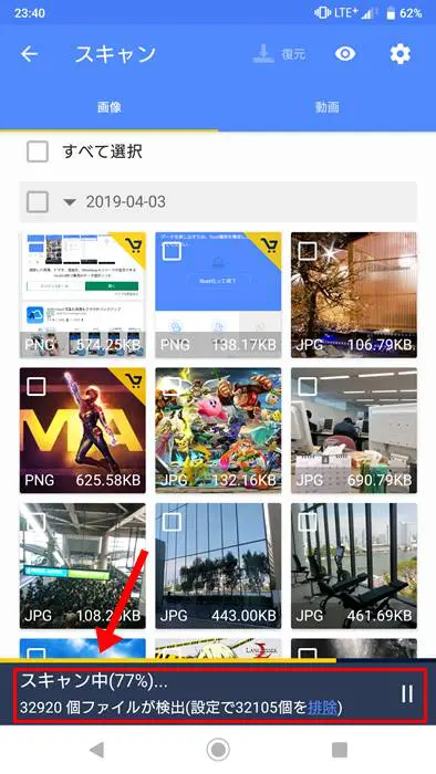 図は課金前ですので、PNGファイルはリストアップされますが復元はできない状態です。