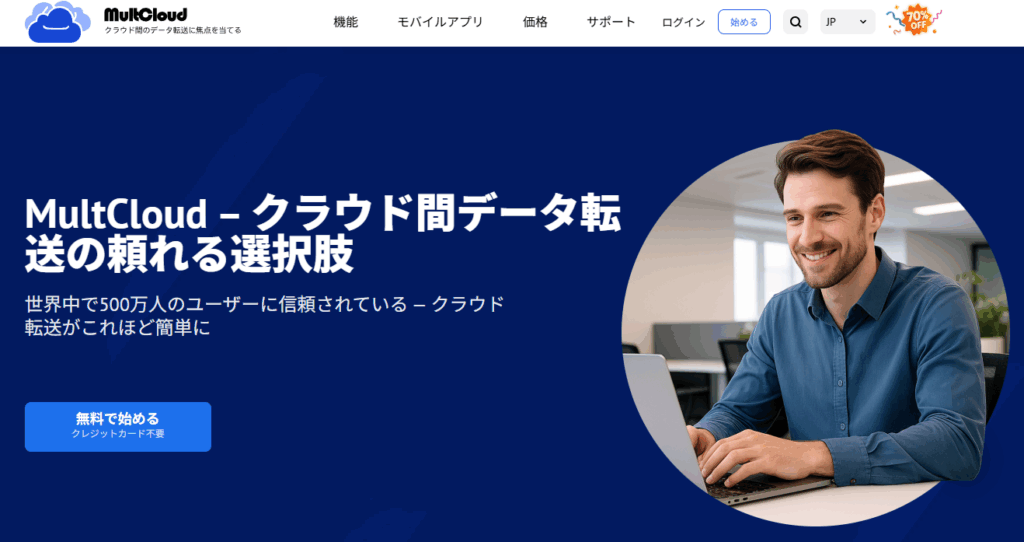 MultCloudの公式ページへ飛び、登録を開始します。下記をクリックするか、「MultCloud」と検索してサイトへ移動し「無料で始める」をクリックします。