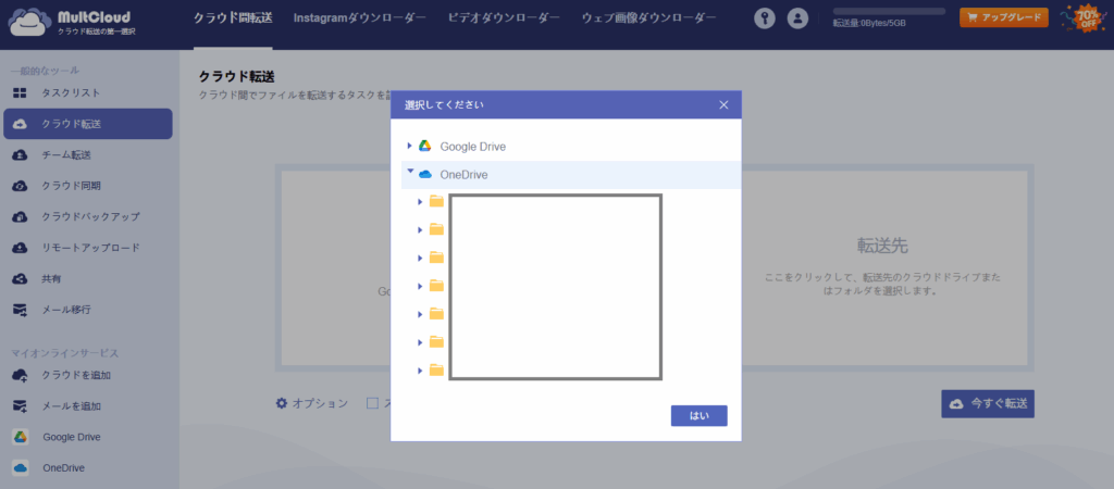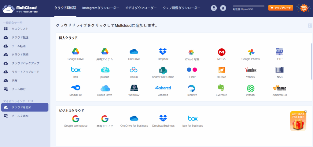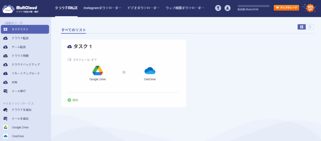 MultCloudは月額5GBまでであれば、無料でCloud間のデータ転送・コピーが可能です。