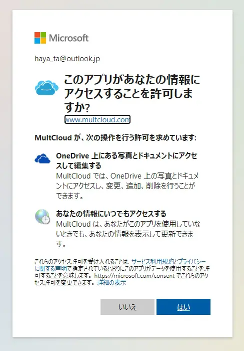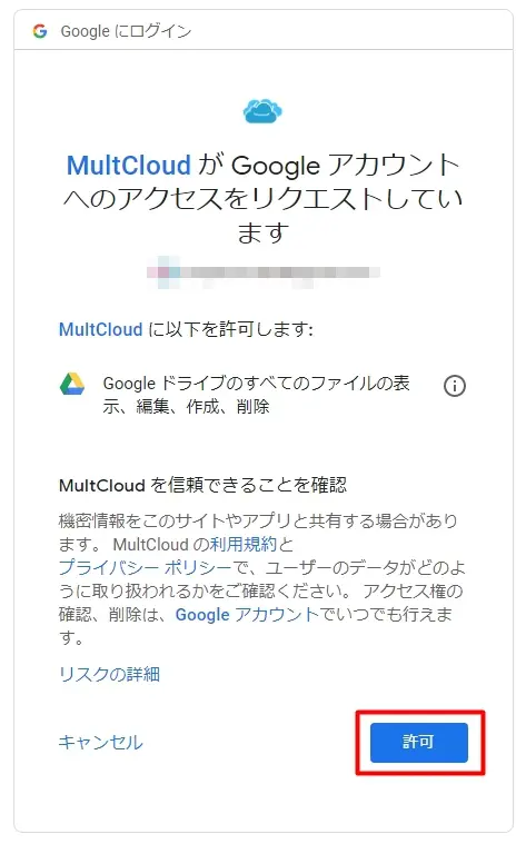 • アカウントとパスアワードが正しいことを確認するとクラウドサービスはMultCloudへデータアクセスを許可