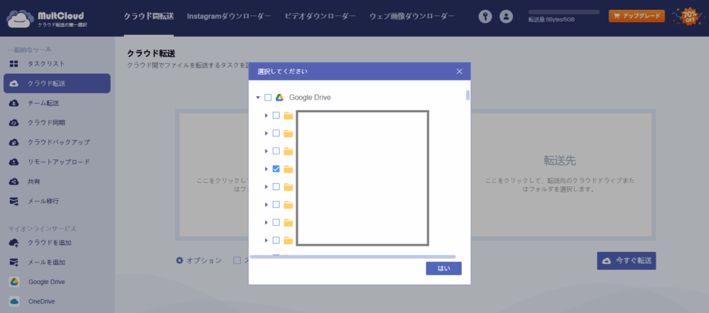 Google Driveを選び「転送したいファイルおよびフォルダー」を選択し「はい」をクリックします。