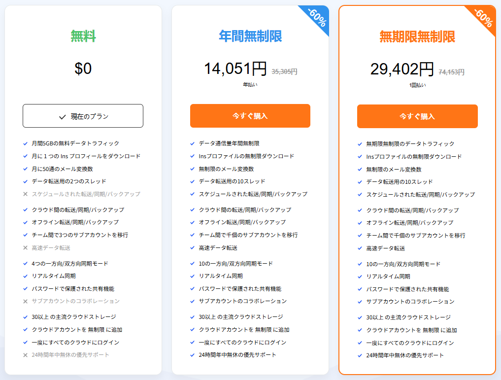 MultCloudではプランごとで通信容量が決まっています。下表は通制限有り版です。
