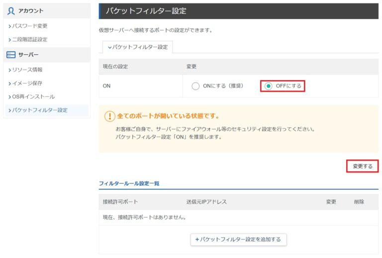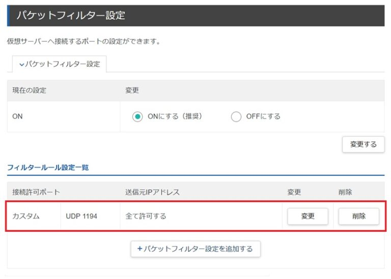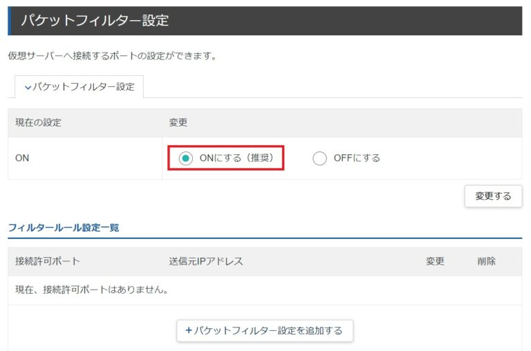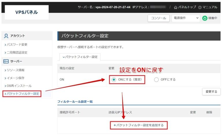 VPSパネルを開き「パケットフィルター設定」をクリックします。設定をONに戻し「パケットフィルター設定を追加する」をクリックします。
