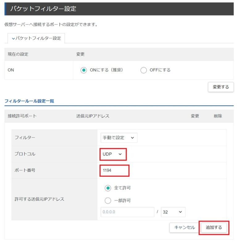 プロトコルは「UDP」を選択、ポート番号には「1194」を入力します。最後に「追加する」をクリックします。