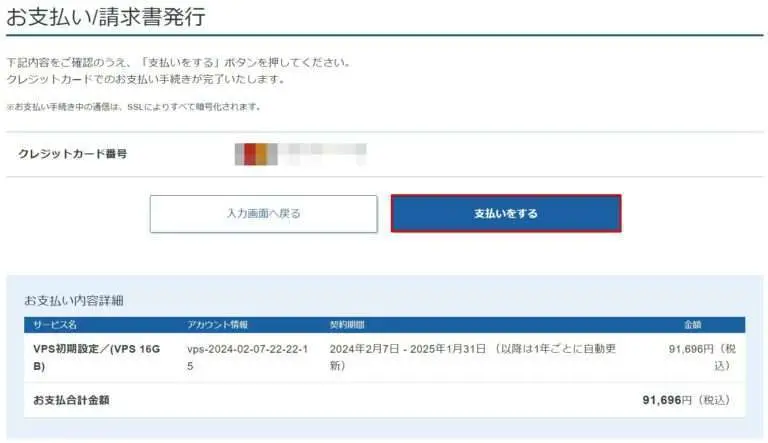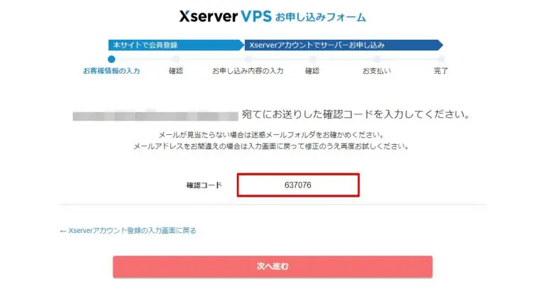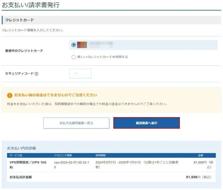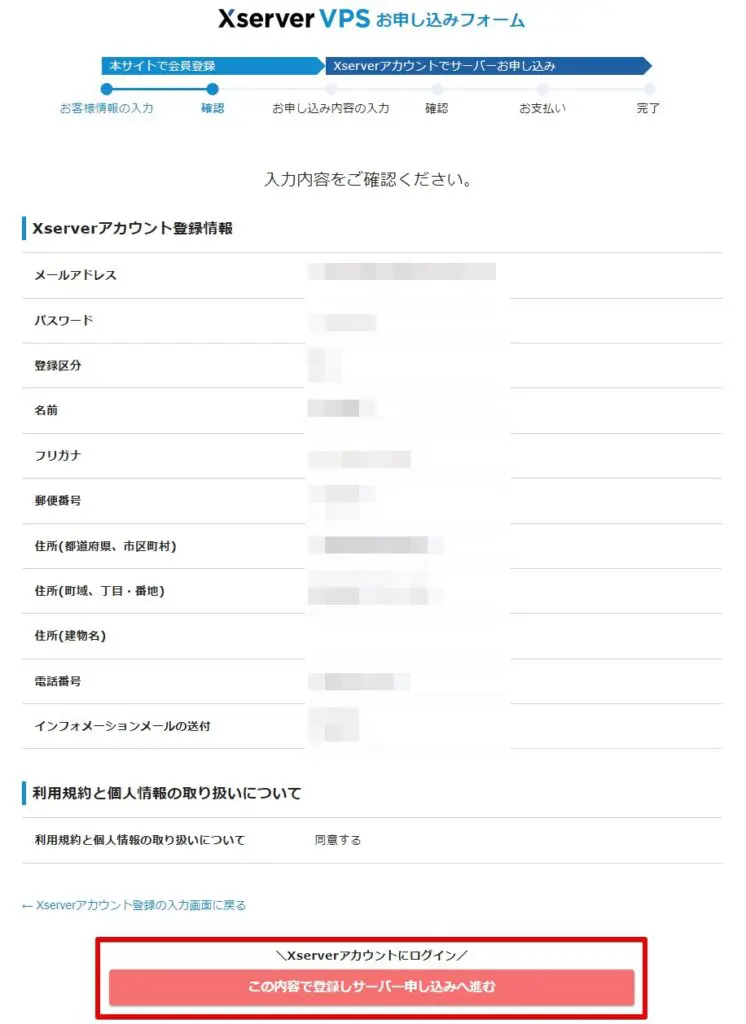 入力内容を確認し「この内容で登録しサーバー申し込みへ進む」をクリックします。