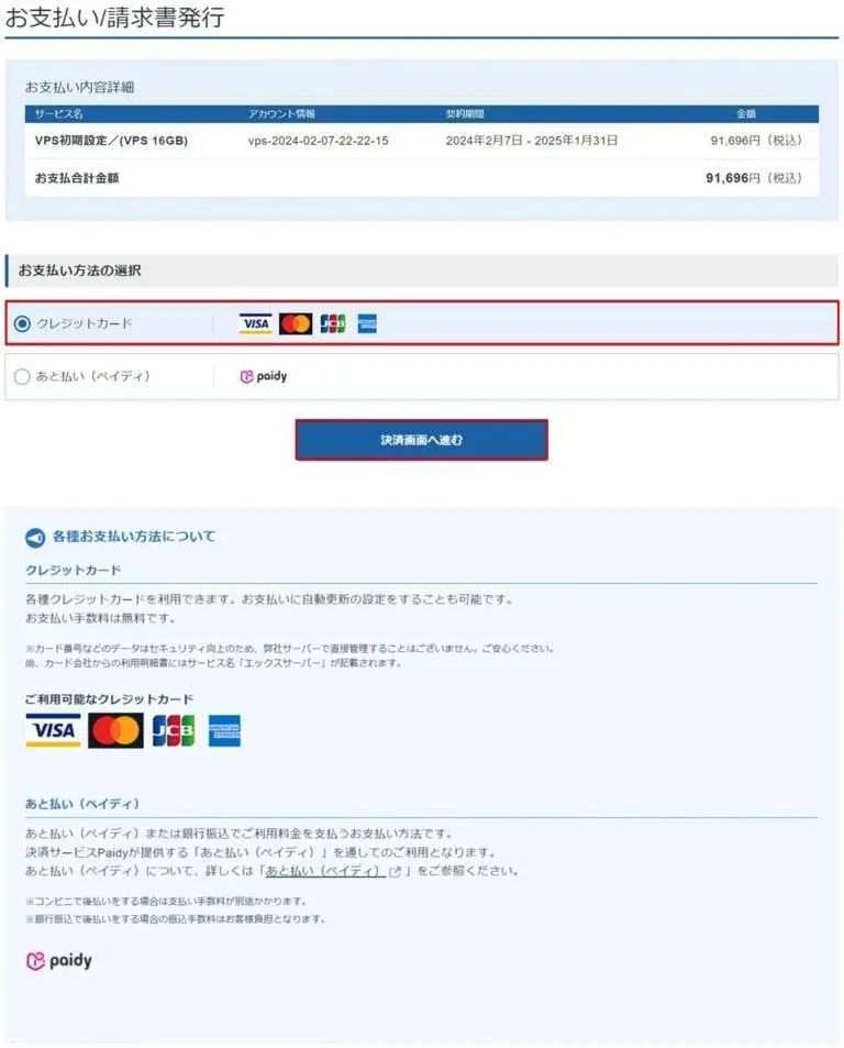 支払い方法を選びます。クレジットカード(デビットカード)か後払いかが選べます。払いやすい方を選びましょう。