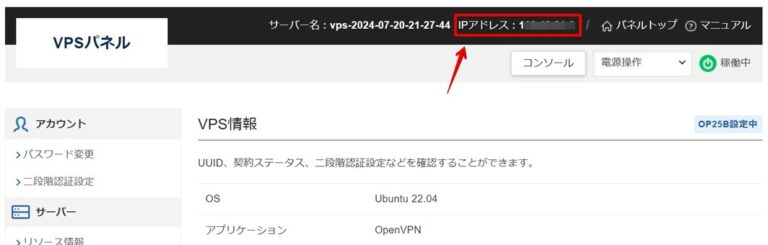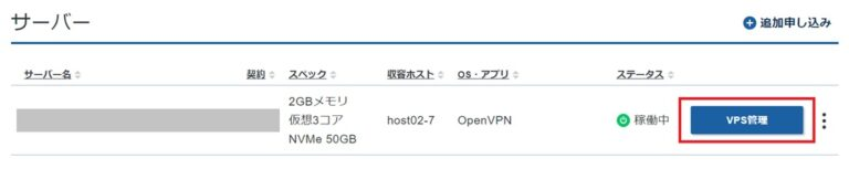 マルチプレイで楽しむためには、作成したOpenVPNへ接続するためのIPアドレスが必要になります。IPアドレスを確認するために、「VPS管理」をクリックします。