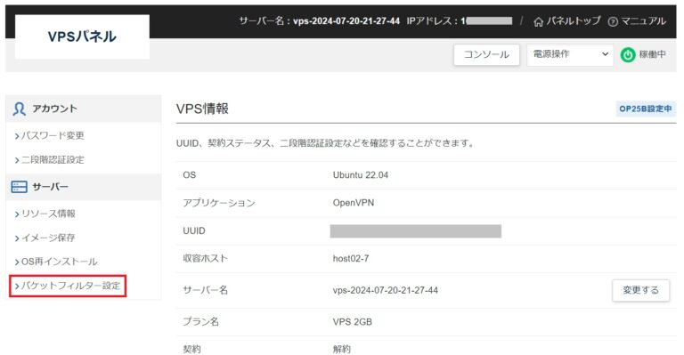 初期申込時ではすべての通信がOpenVPNサーバーに対して拒否する設定がされているので、パケットフィルター設定してそれを解除します。「VPNパネル」から「パケットフィルター設定」をクリックします。