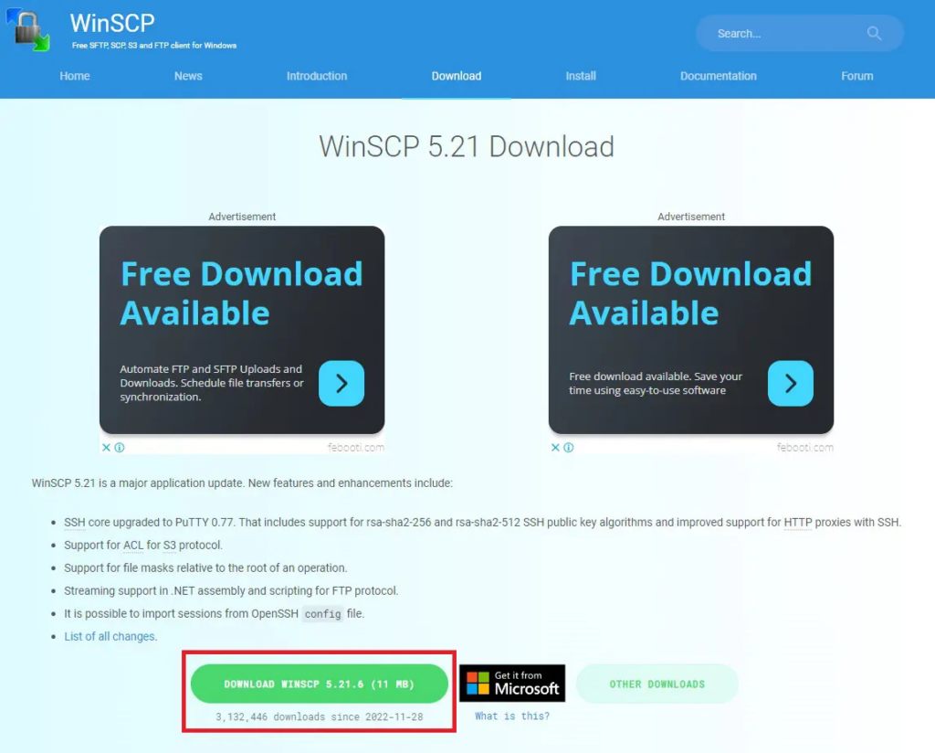 WinSCP公式サイトに移動しますので、画面下にあるダウンロードボタンをクリックします。