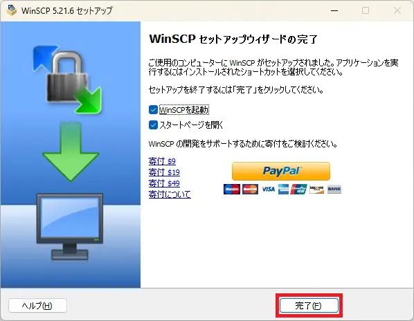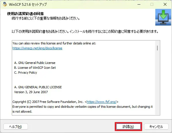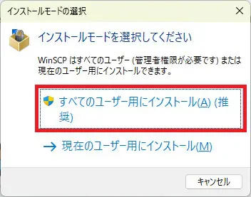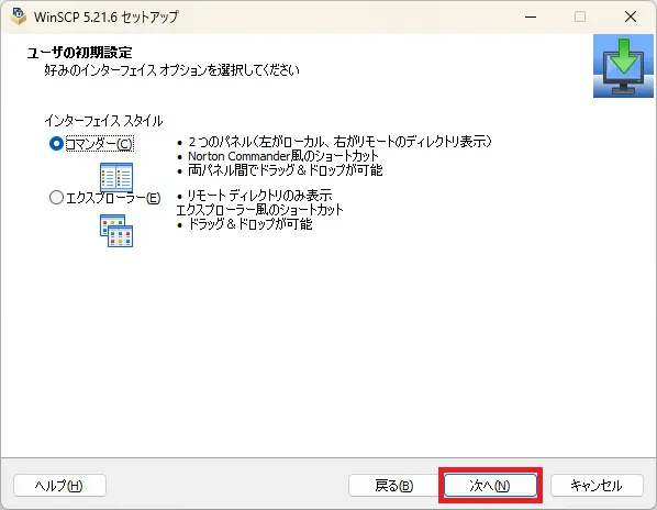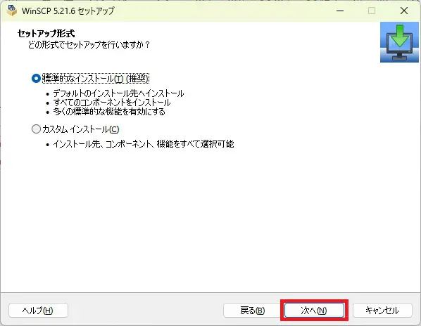 ダウンロードしたWinSCPのセットアップファイルをダブルクリックしてWinSCPをインストールします。画面に従っていくだけで簡単にインストールできます。
