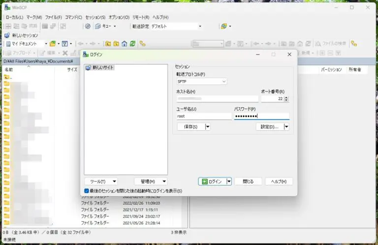 WinSCPが起動しますので、以下を参考に入力し「ログイン」しましょう。