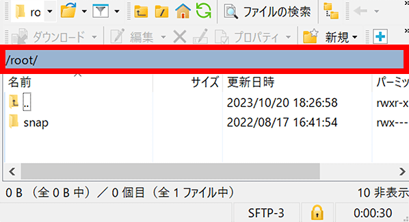 WinSCPにログイン完了後、右画面のサーバー環境より下記赤枠の箇所をクリックしてください。