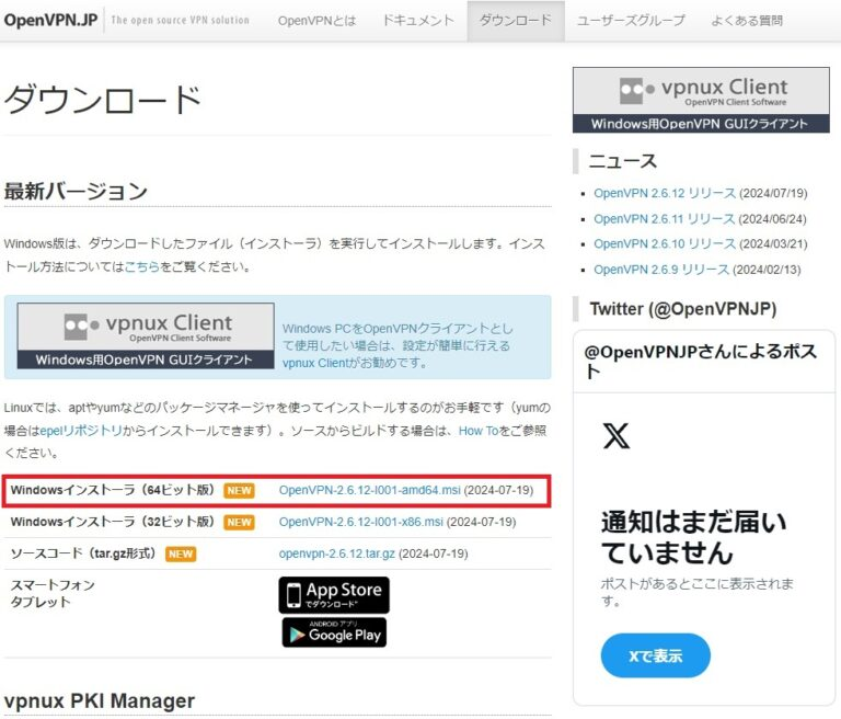 OpenVPNの公式サイトへ入り、クライアントアプリをダウンロードします。画面はWindows版ですが、Macでもやることはまったく同じです。