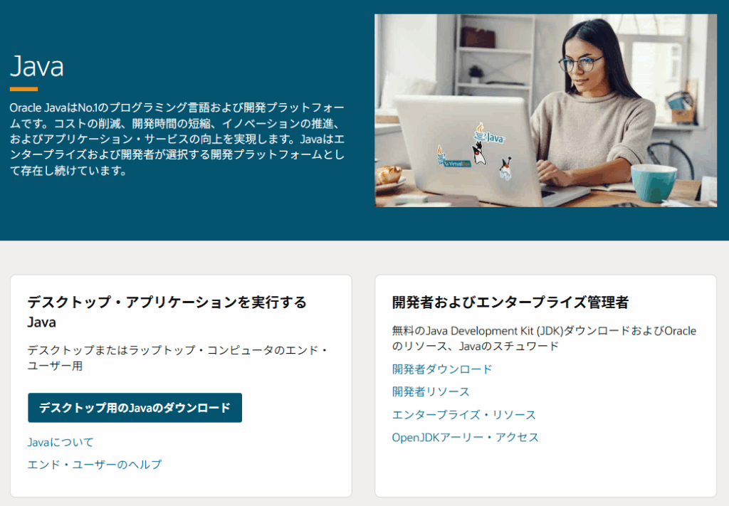 https://java.comへアクセスし、デスクトップ用のJavaのダウンロードをクリックします。