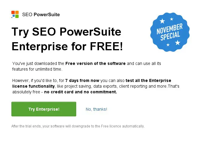 「Try Enterprise!」か「No, thanks!」を選びましょう。初めてであれば「Try Enterprise!」で進めましょう。