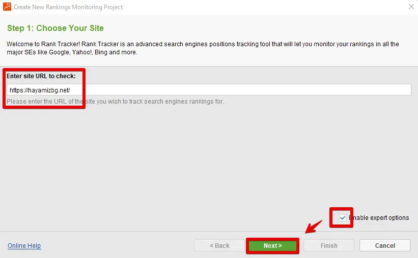 - 入力後、「Enable expert options」にチェックを入れて「Next」をクリックします。