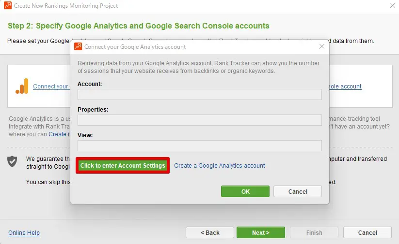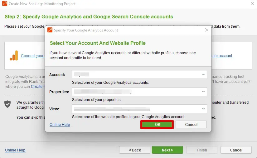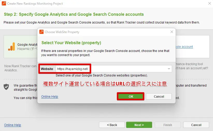 認証後、Websiteの登録画面が表示されますので、Rank Trackerで計測したいURLを指定し「OK」をクリックします。