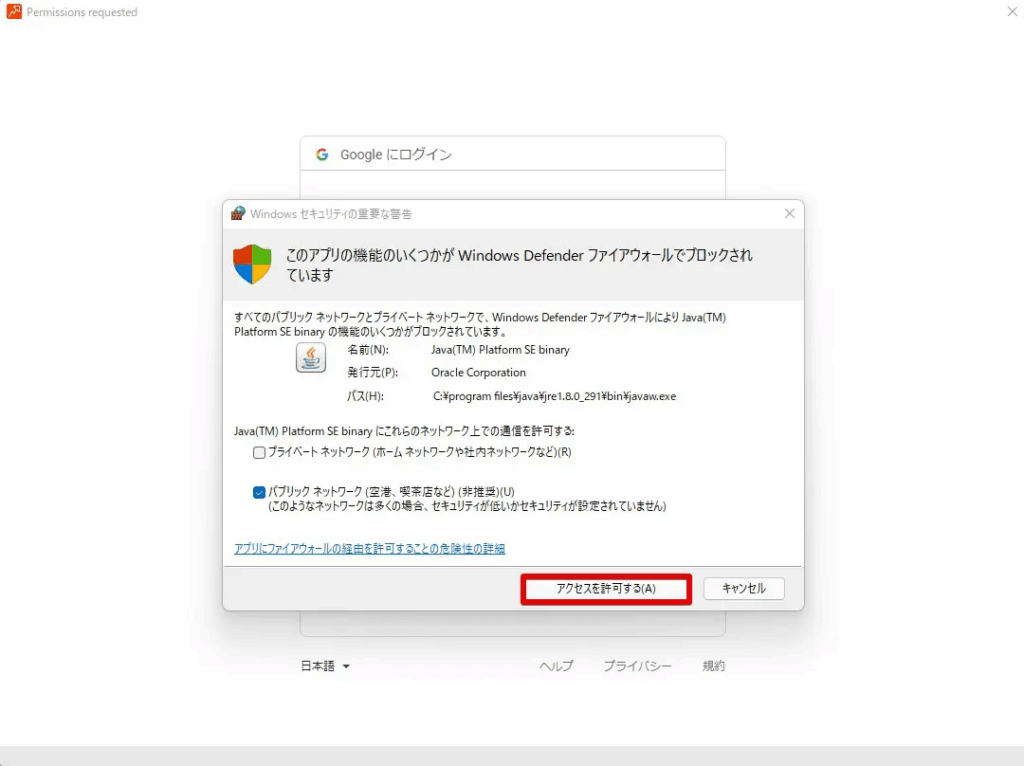 Windows Defenderが表示された場合は「アクセスを許可する」をクリック