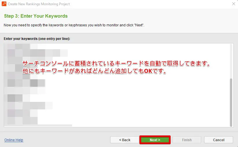 キーワード入力画面が表示されるので必要なキーワードを入力し「Next」をクリック