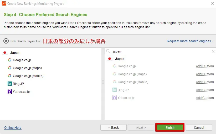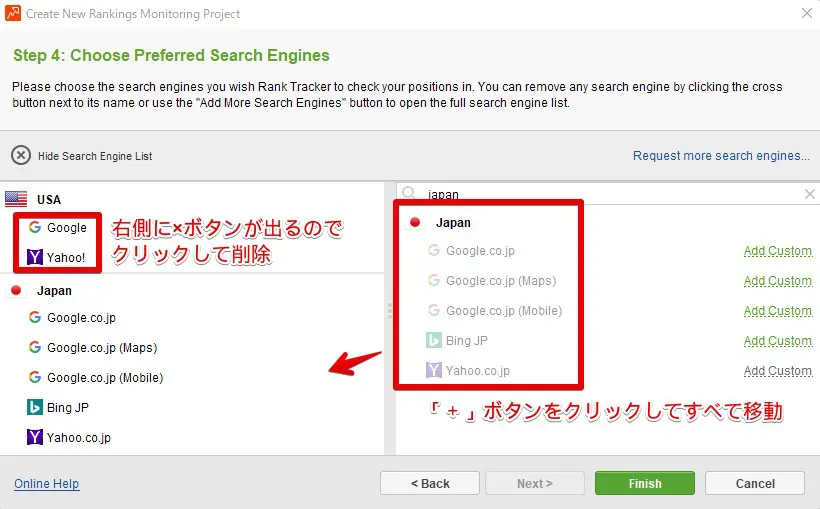 Japan選び、表示されたすべての検索エンジンを左側へ移動します。該当の検索エンジンにマウスを持っていくと「+」が表示されますので、それをクリックすれば左側へ移動します。