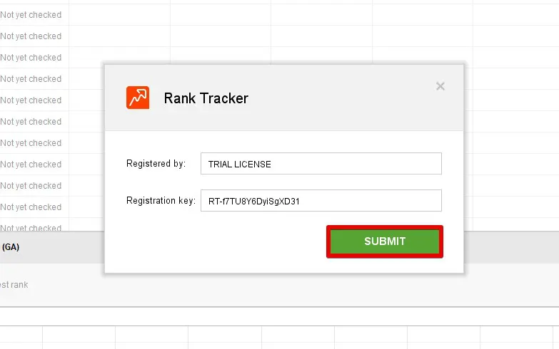 ライセンス入力を促されますがトライアル版は下記のように表示されます。もしRank Trackerを購入していない場合とりあえず使ってみる!という場合はそのまま「SUBMIT」をクリックします。