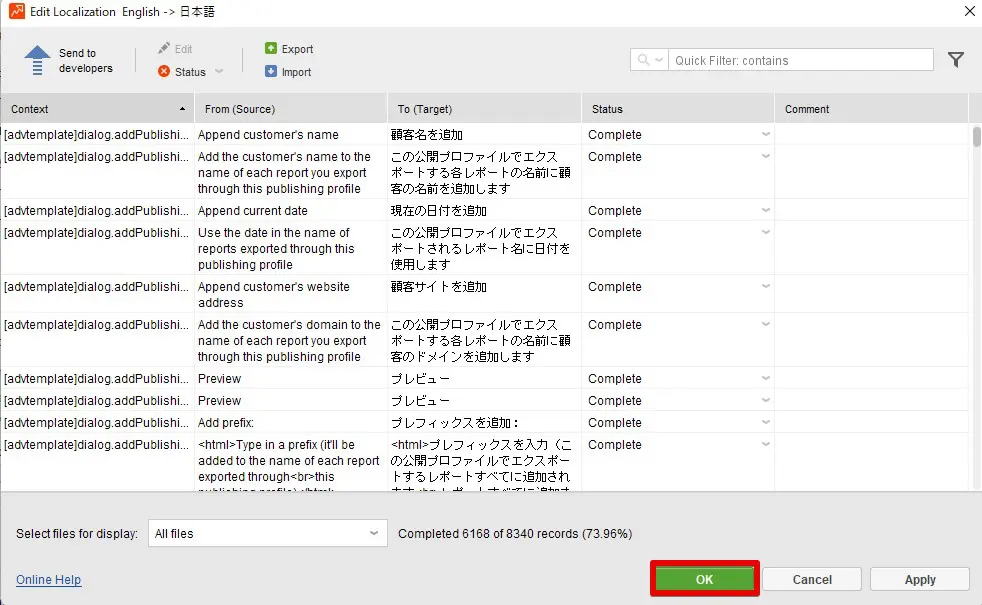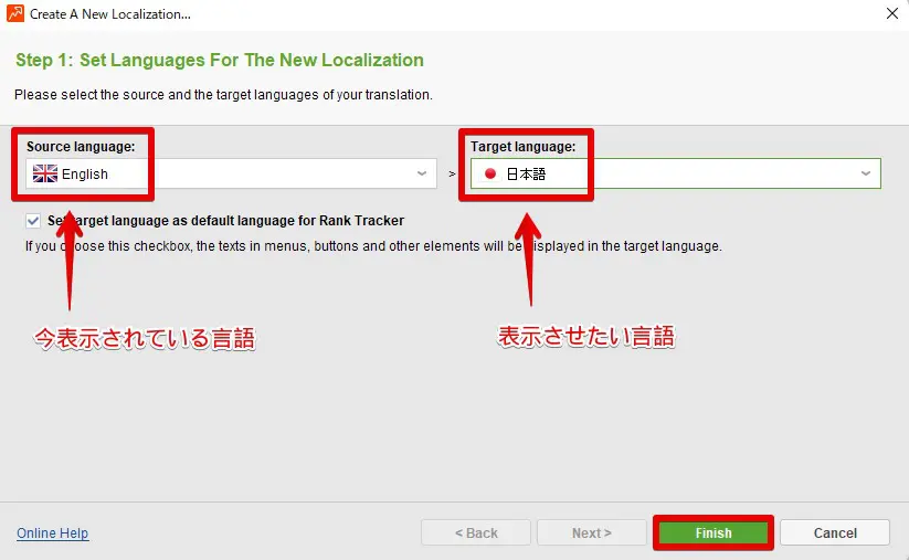 「今表示されている言語(Source language)」にEnglish、「Target language(表示させたい言語)」に日本語を選び「Finish」をクリックします。