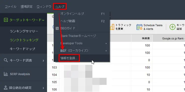 Rank Trackerの「ヘルプ」「情報を登録」をクリックします。