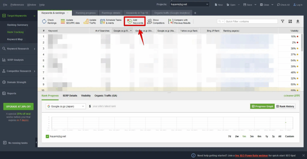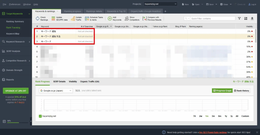 狙ったキーワードで記事を作成しましたら、Rank Trackerにもキーワードを追加していきましょう。