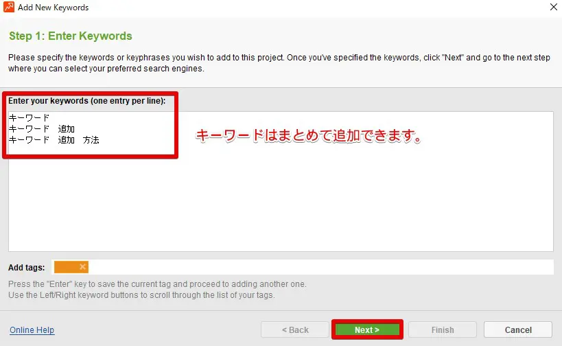 キーワードを入力します。複数入力ができます。入力完了後「Next」をクリックします。