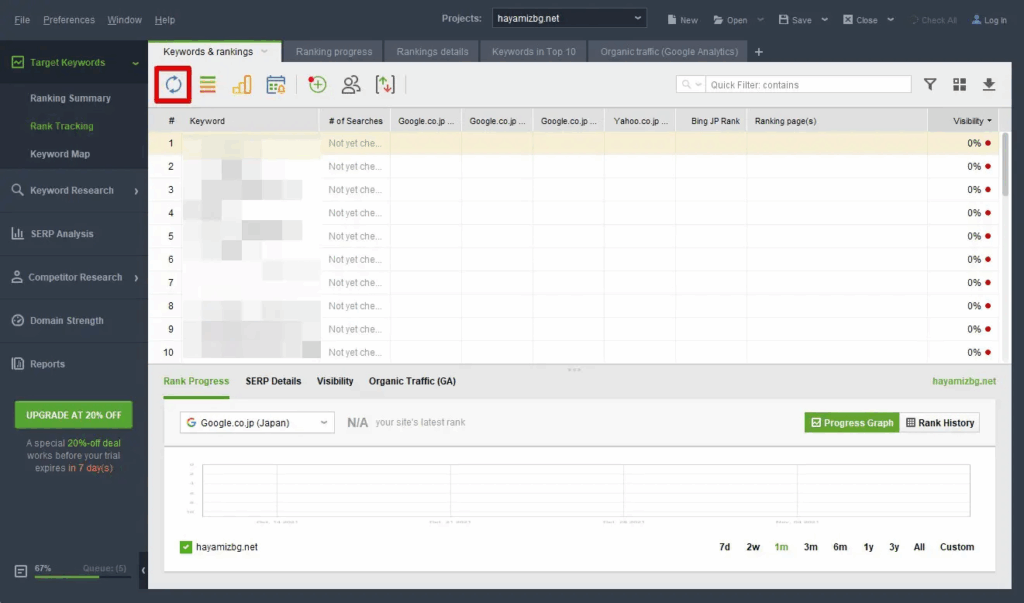 初期設定完了後、キーワードがすでに入力されている場合、「更新」ボタンをクリックするとキーワードの順位チェックが始まります。キーワード数が多いと時間もかかりますので待ちましょう。