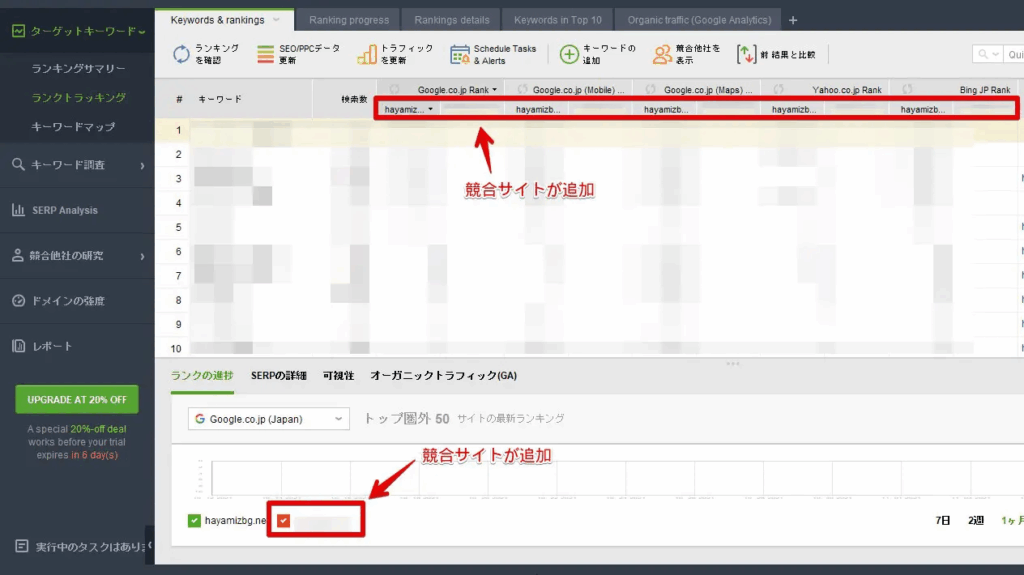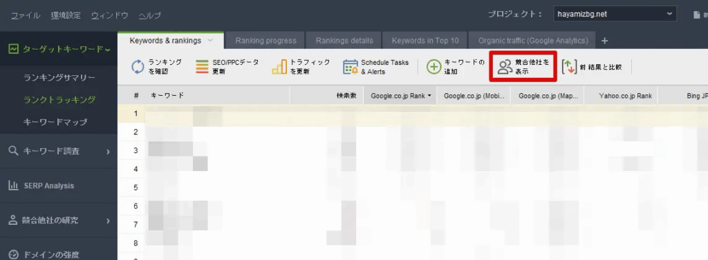 Rank Trackerは同様のキーワードを使って競合サイトの順位チェックを行うことができます。難しい手順はなく競合サイトのURLを追加するだけですので、特化サイトを運営されている人は要チェックの機能です。