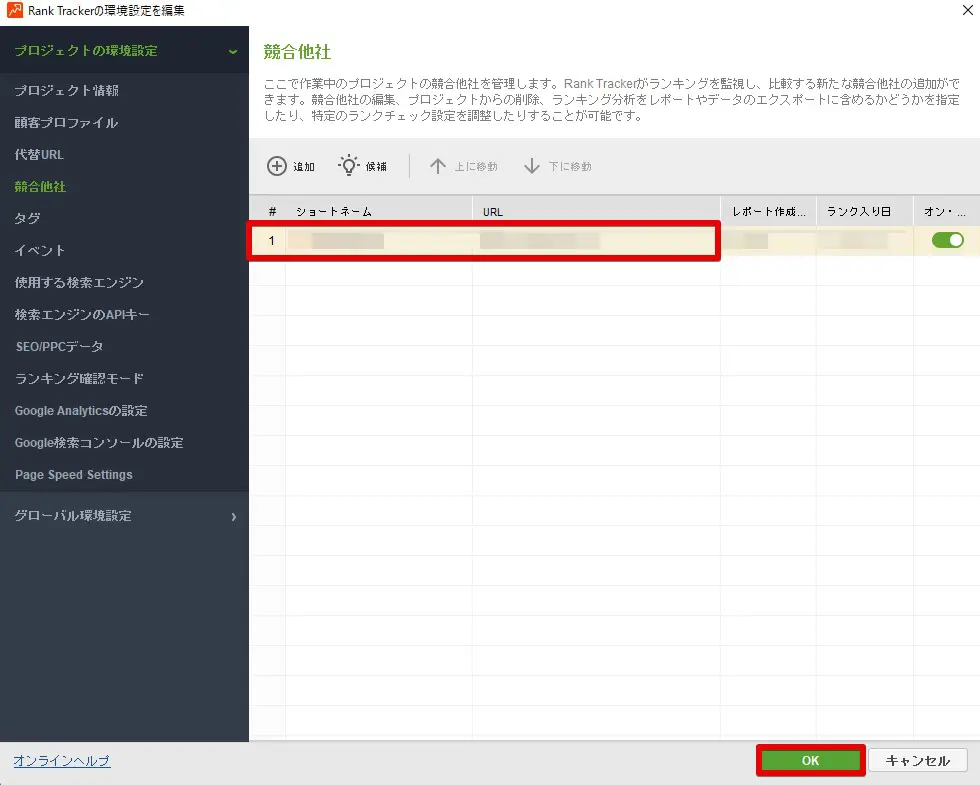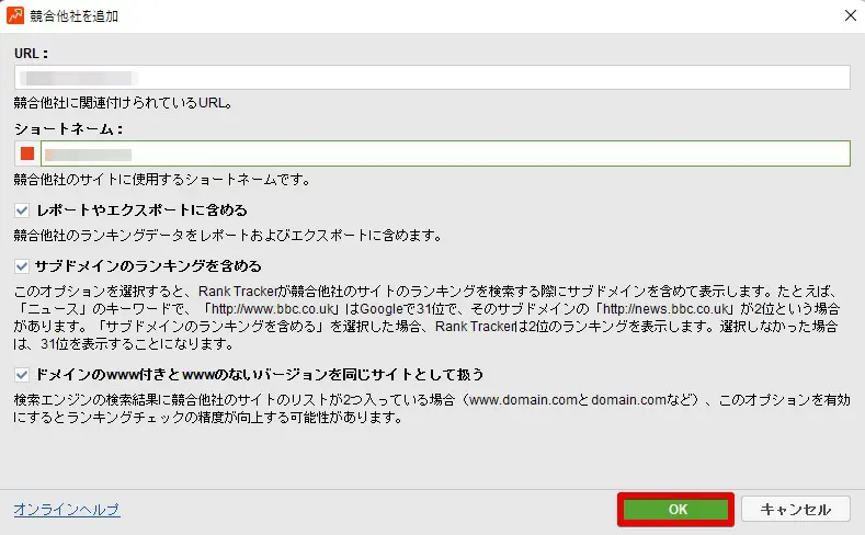 競合サイトのURLとショートネーム(判別しやすい名前)を入力し「OK」をクリックします。